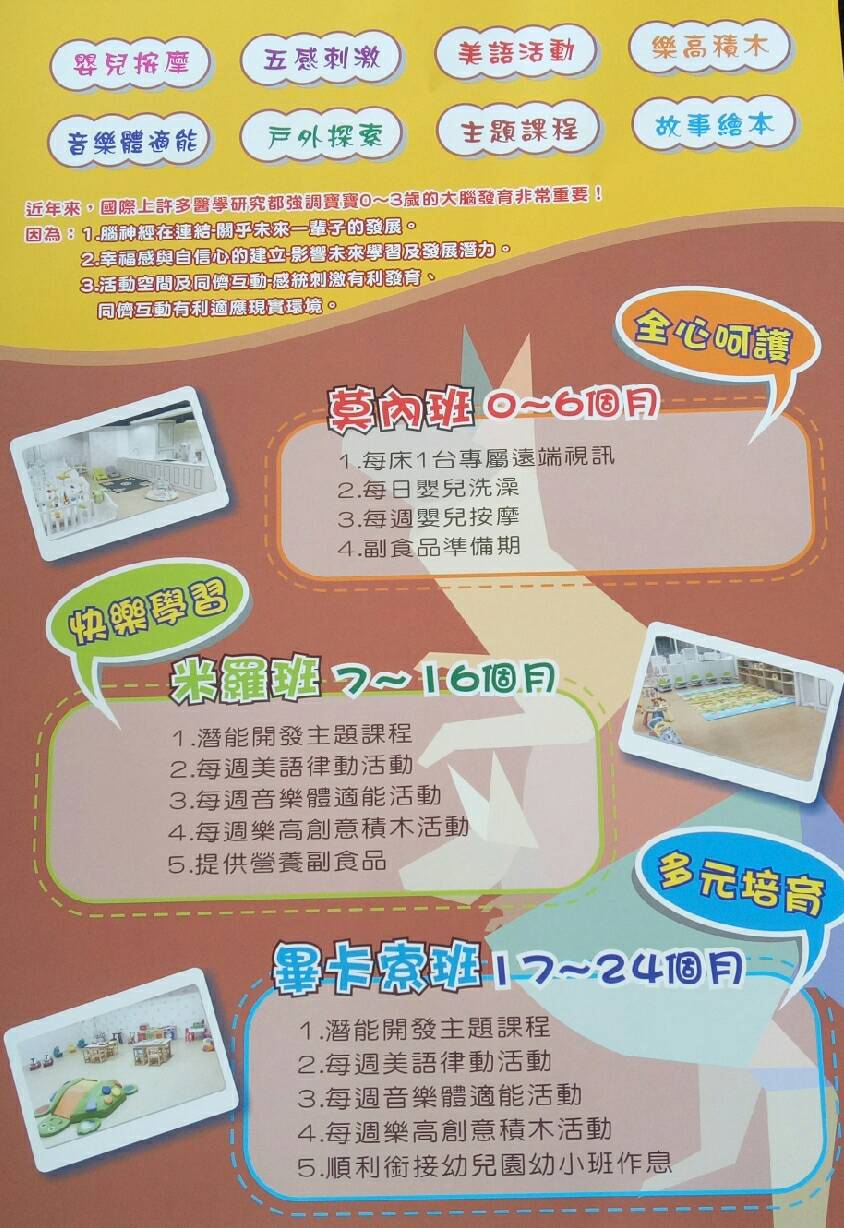 日托、可供三餐.(點心,中餐,下午點心) 教孩子認知、生活自理能力、手眼協調等感官訓練以及幫孩子 沐浴、減輕父母的負擔。 2歲的孩子開始教英文、注音符號、數字、形狀、顏色、認知以及筆劃塗鴨。